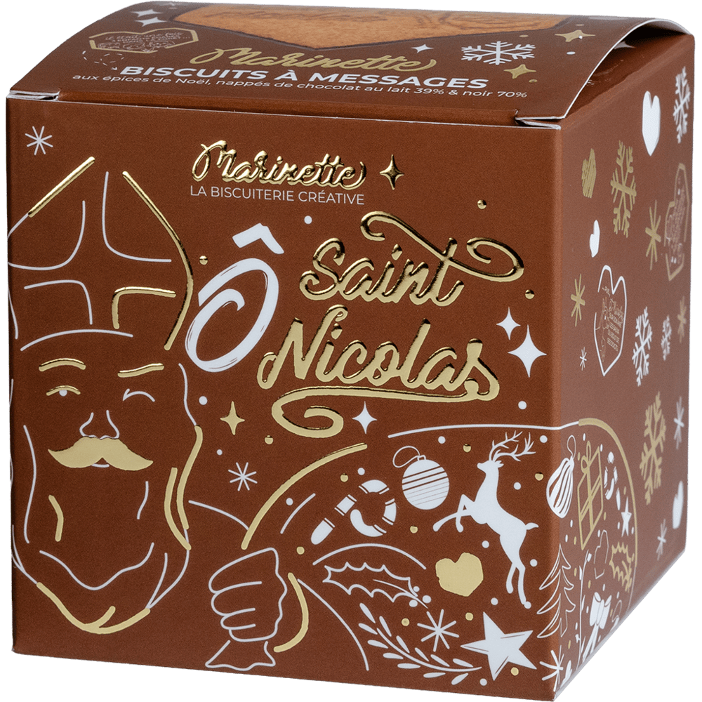 Wheat flour from the Vosges, butter from Meuse, sugar from Alsace, good dark chocolate 11% (cocoa mass 62.5%, lecithin from soy, natural vanilla flavour), good milk chocolate 11% (sugar, cocoa butter, whole milk powder, cocoa mass, emulsifier: lecithin from soy, natural vanilla flavour), egg yolk, egg white, spices 1.5% (anise, cinnamon, ginger, coriander), fleur de sel, and that’s it!" -